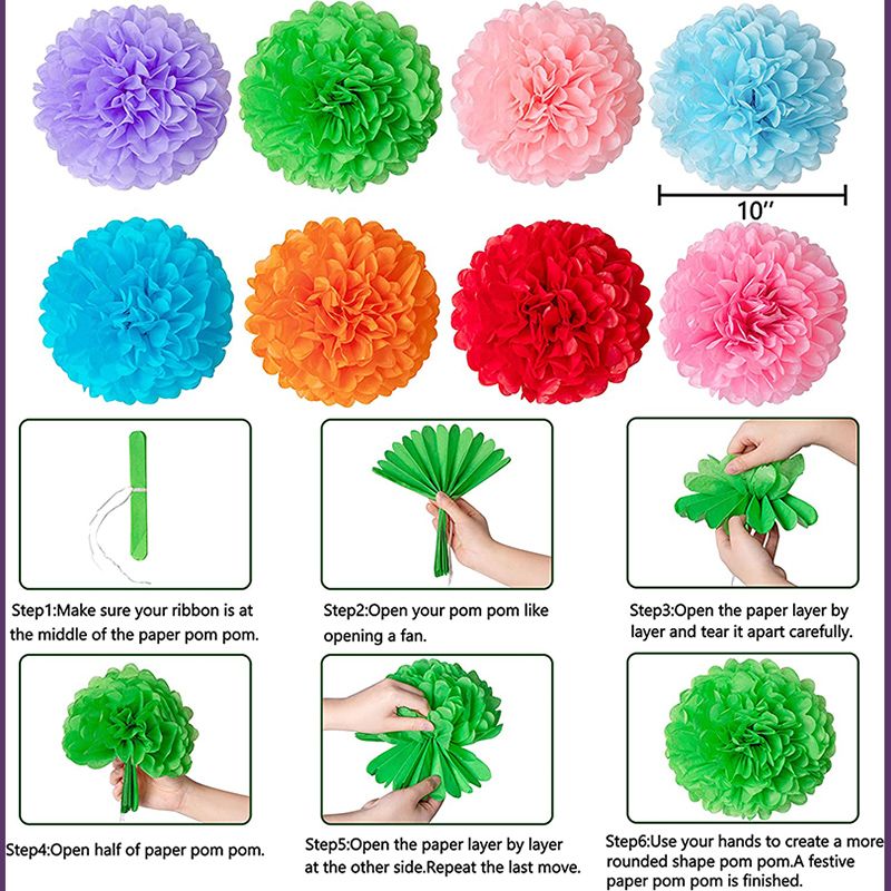 You can simply unfold each and secure with a self-sealing sticker; or use a paper clip. Both methods work perfectly. Both banners and hanging swirls can be hung. NOTE: The paper pom poms require assembly.
