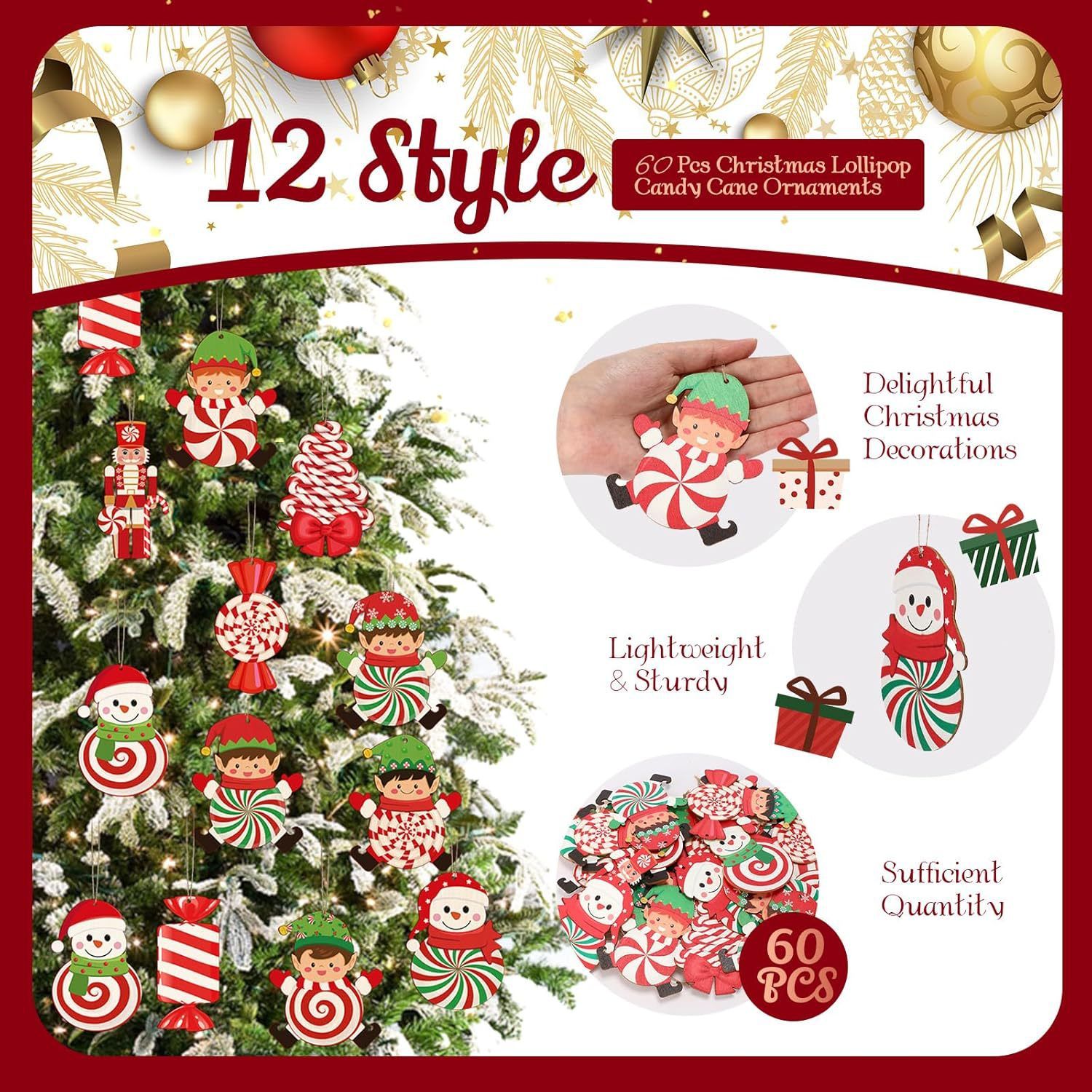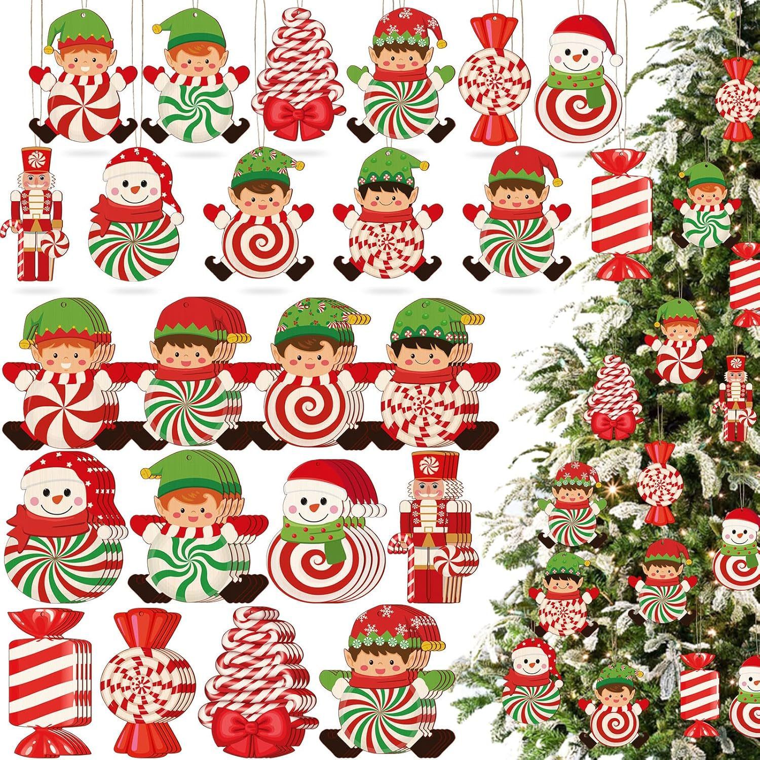 Specifications Material: Wooden Feature: Candy, Snowman, Santa Claus Package contents: 24PCS Christmas Tree Wooden Ornaments