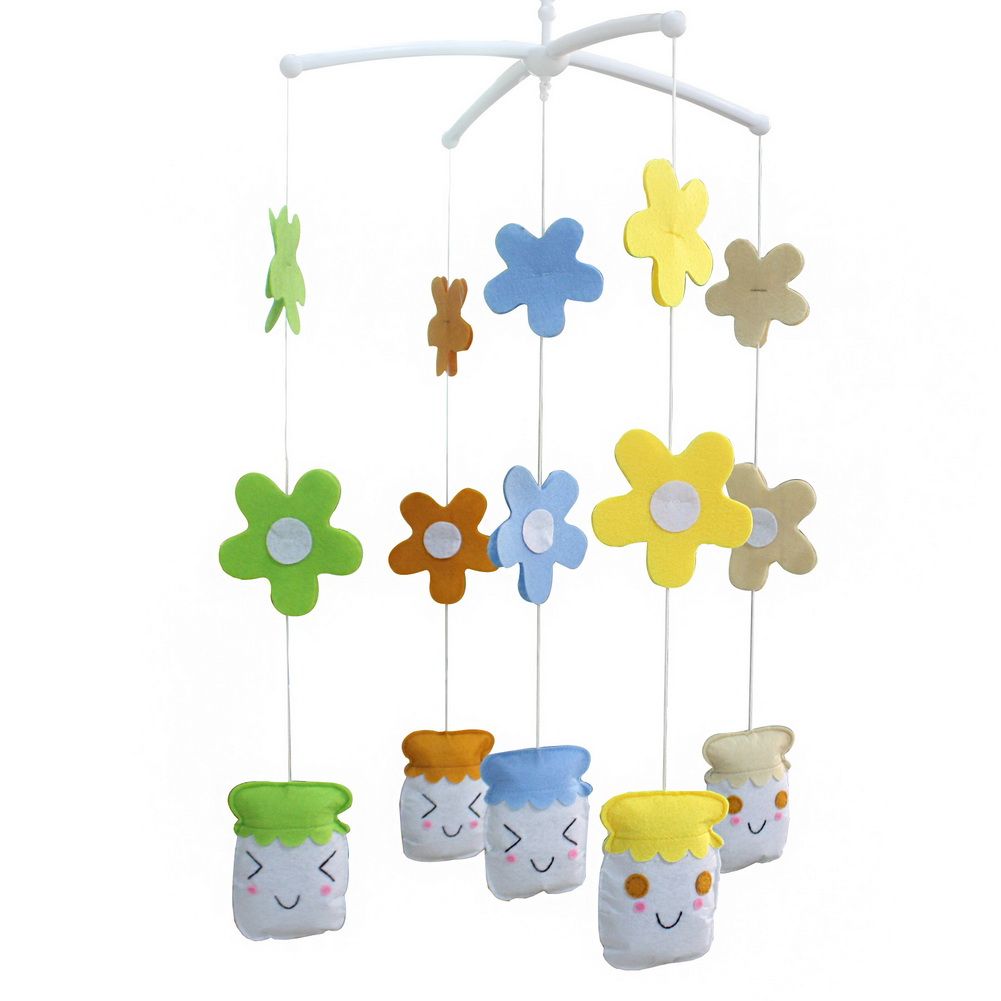This handmade baby crib mobile plays light music to help your baby easily fall asleep. Easy operation and convenient to use; it will rotate while playing music. Each bed bell plays Only One soothing pure and light song. Keep baby calm and happy. It is an essential product for baby and nursery. Perfect for baby shower or mom-to-be gift for baby's nursery. Baby's nursery room decoration. The toys are made from nonwoven fabric.